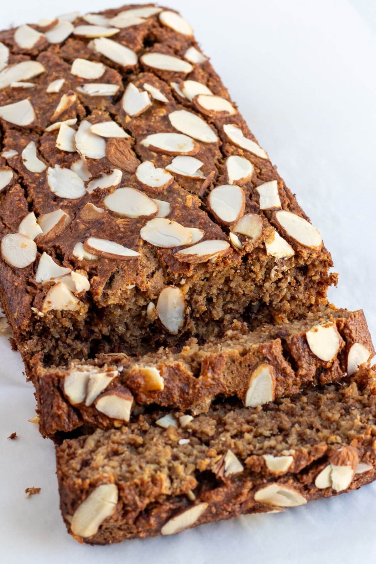You only need a few pantry staples: ripe bananas, rolled oats, eggs, honey, and baking soda. Mix everything in a blender, pour into a loaf pan, and bake. That's it. You can top it with sliced almonds, walnuts, or even chocolate chips for extra texture.